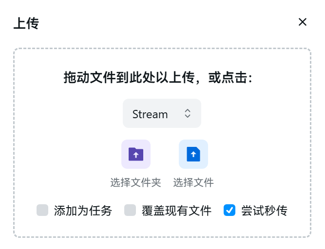 - Stream:直接把文件二进制内容放进 body 中,这样后端可以使用很少的内存,似乎没有什么其他的缺点。